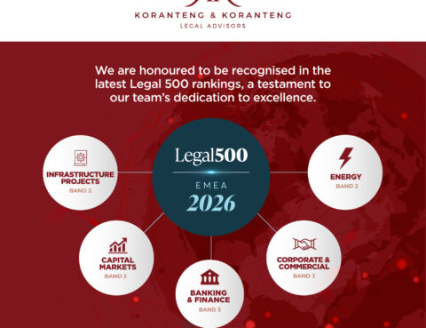 Koranteng & Koranteng Legal Advisors Recognized in The Legal 500 EMEA 2026 Rankings We are honoured to announce that Koranteng & Koranteng Legal Advisors has been officially recognized in the latest Legal 500 EMEA 2026 rankings. Excellence Across Key Practice Areas The firm has secured notable rankings in the following categories: Band 2: Infrastructure Projects Capital Markets Energy Band…