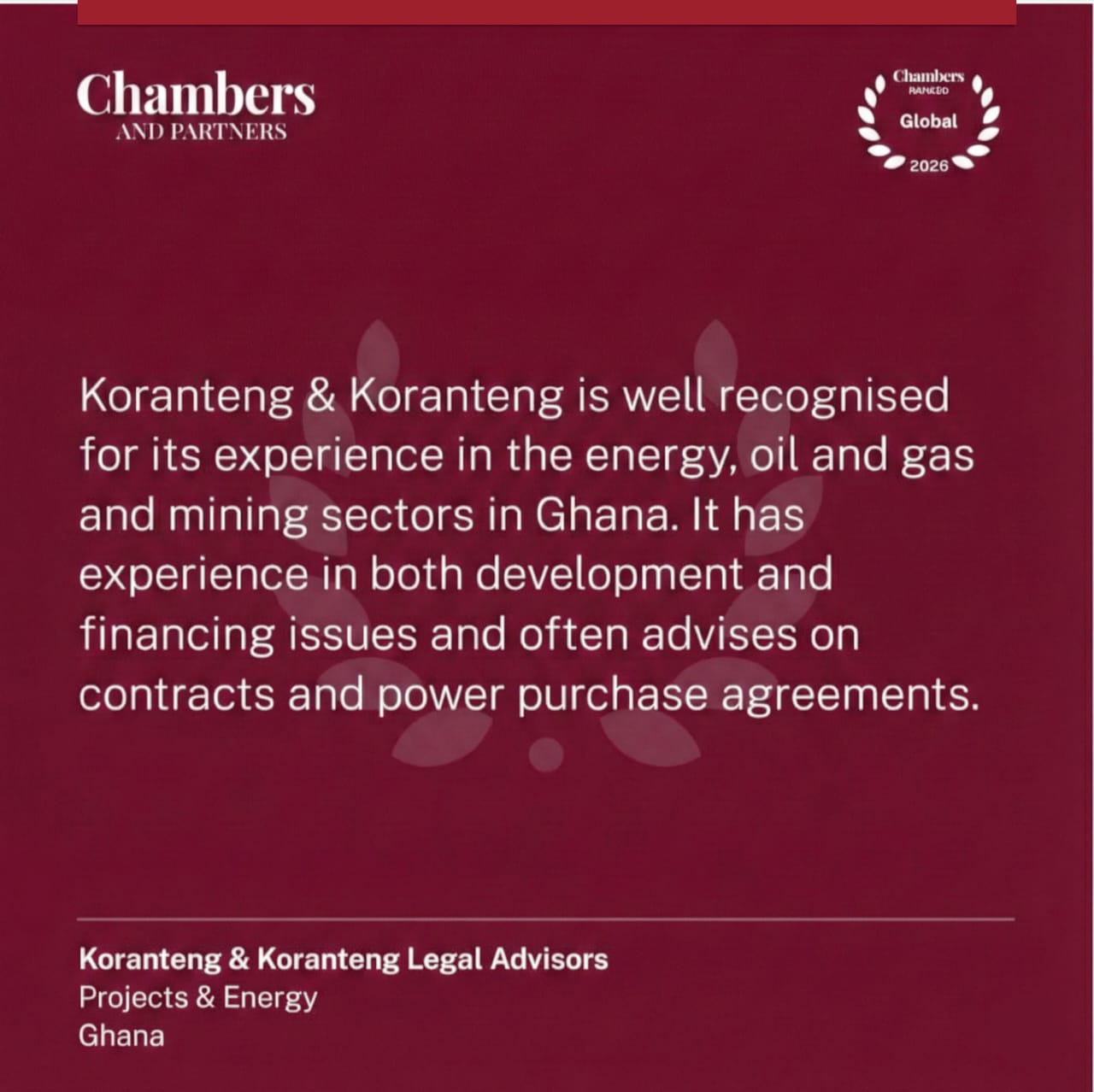 Each year brings new milestones and renewed purpose. We are proud to share that Chambers and Partners, the globally authoritative ranking institution for law firms and lawyers since 1990, has once again recognised Koranteng & Koranteng Legal Advisors in the Chambers Global 2026 Guide.